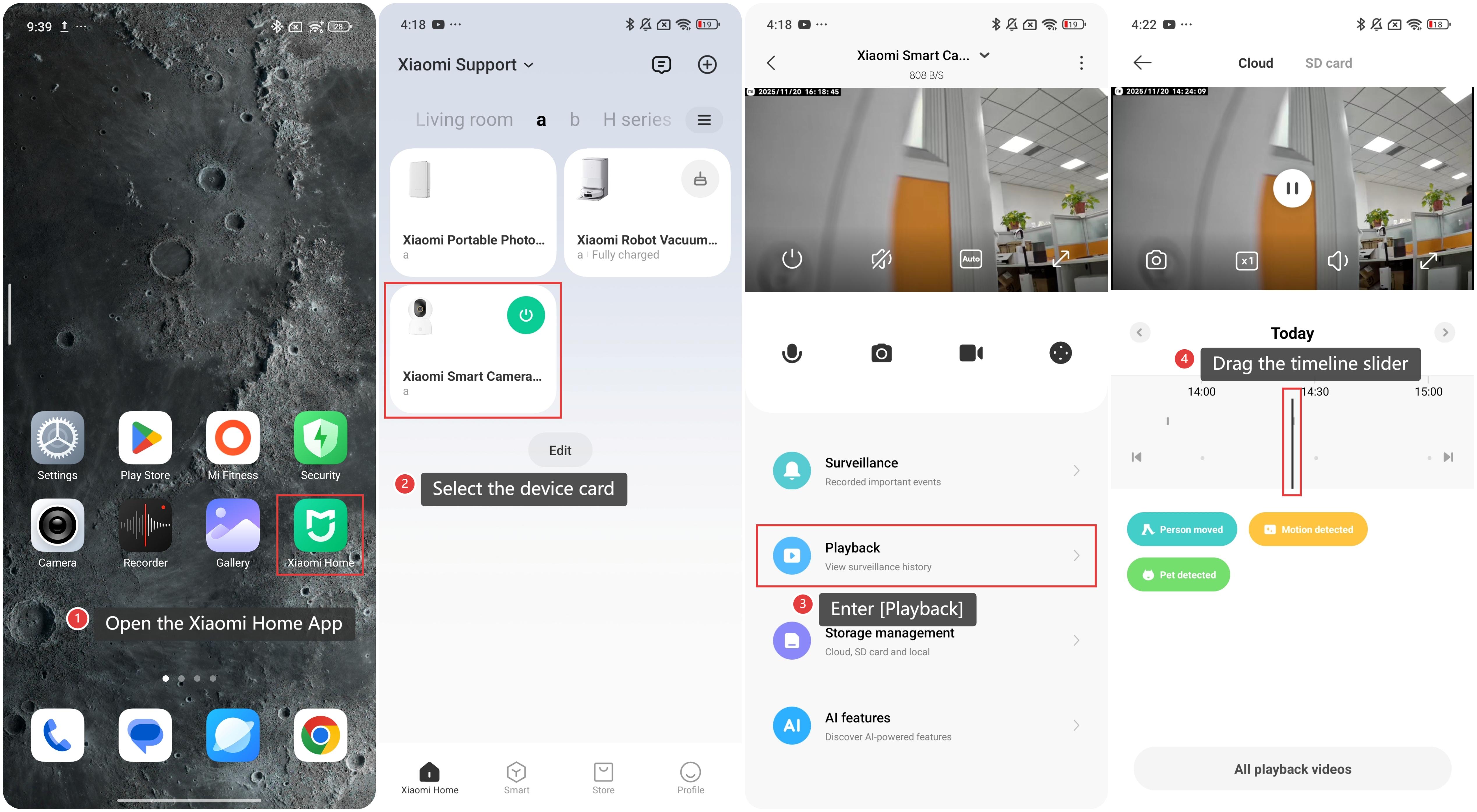 Xiaomi Home Secure tarafından kaydedilen videoları görüntülemek için zaman çizelgesini sürüklemek için lütfen aşağıdaki adımlara bakabilirsiniz: