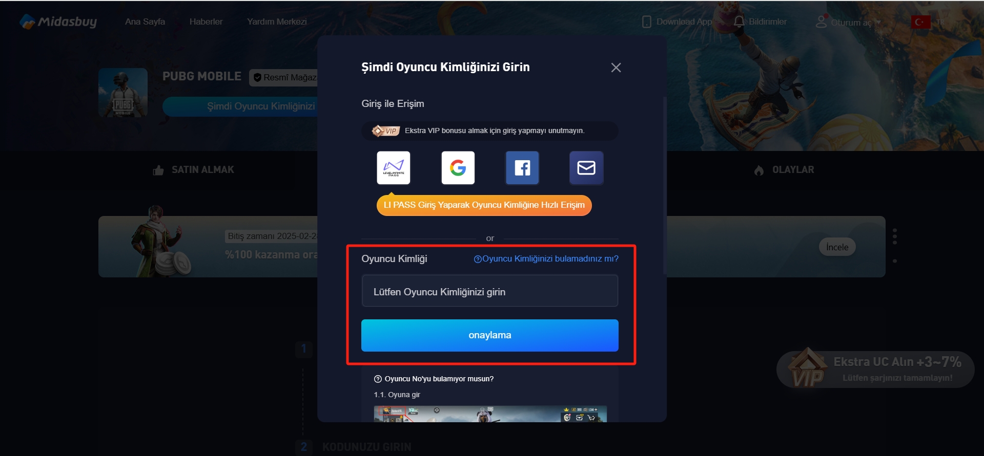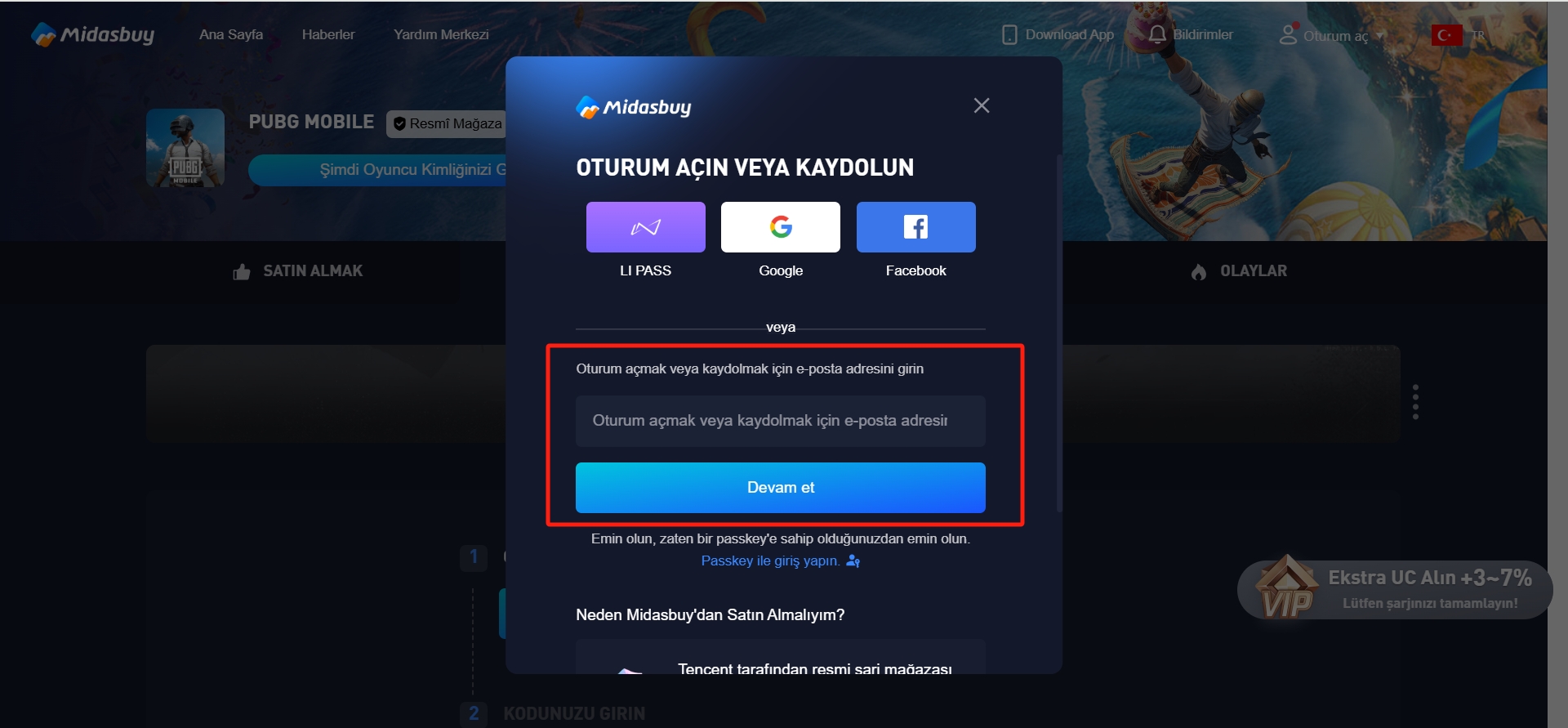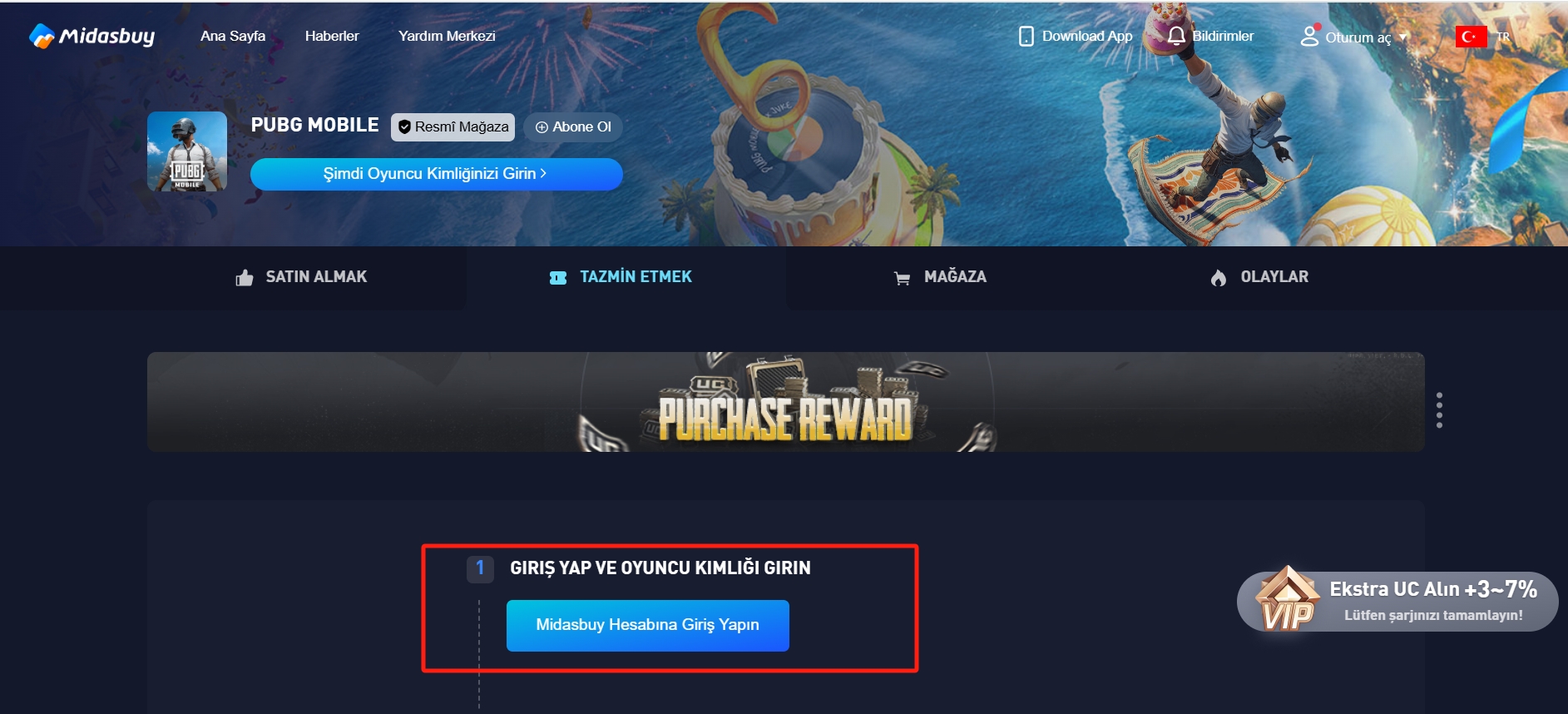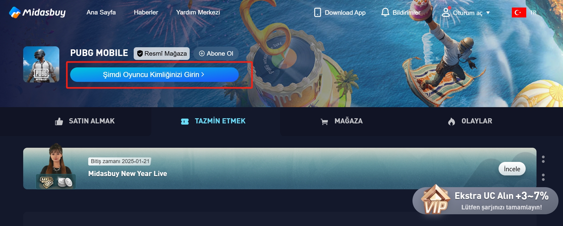 midasbuy.com/midasbuy/tr/redeem/pubgm sayfasını açın. Açılan sayfadan Giriş/Kayıt seçeneğine tıklayın.
