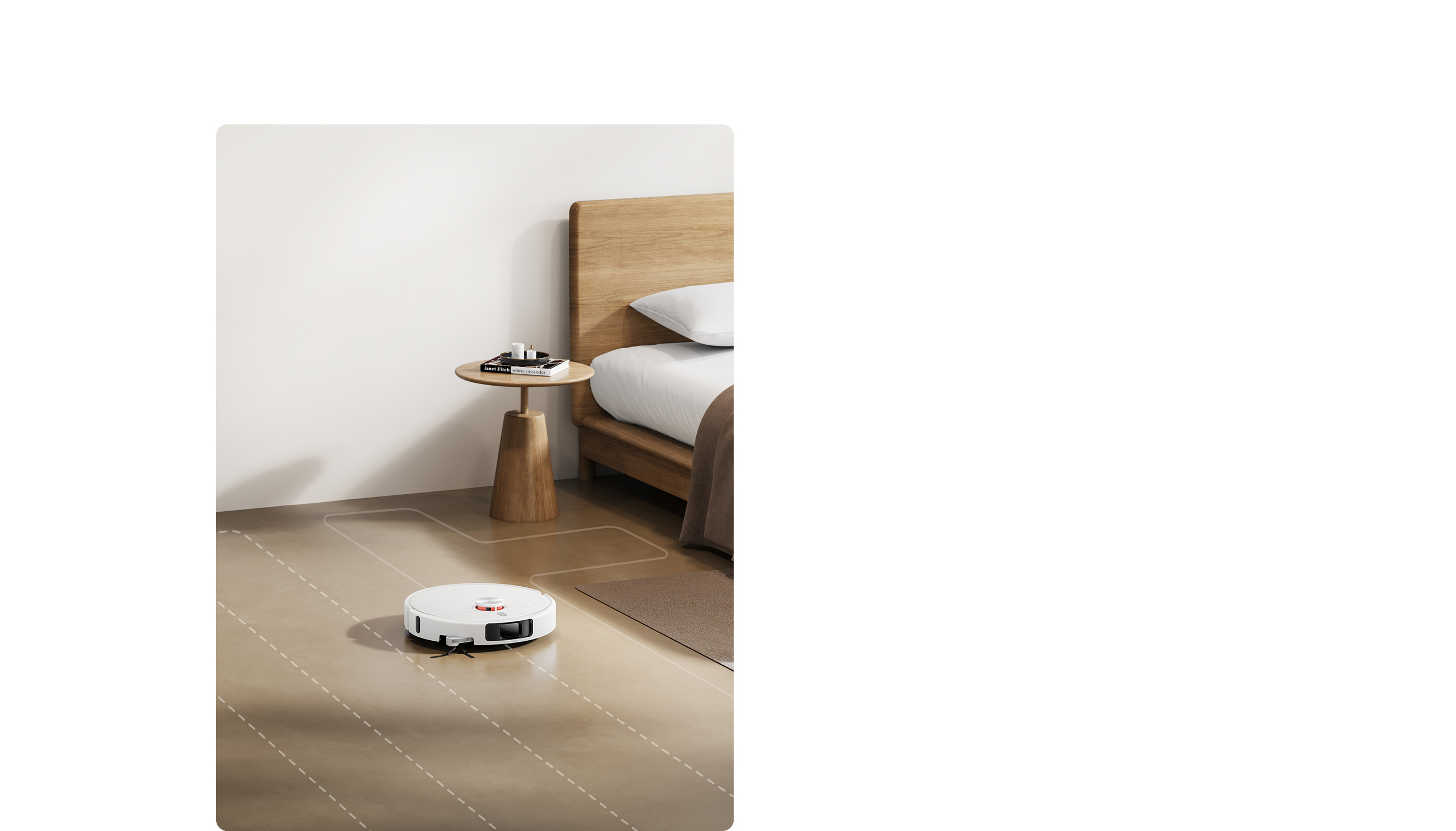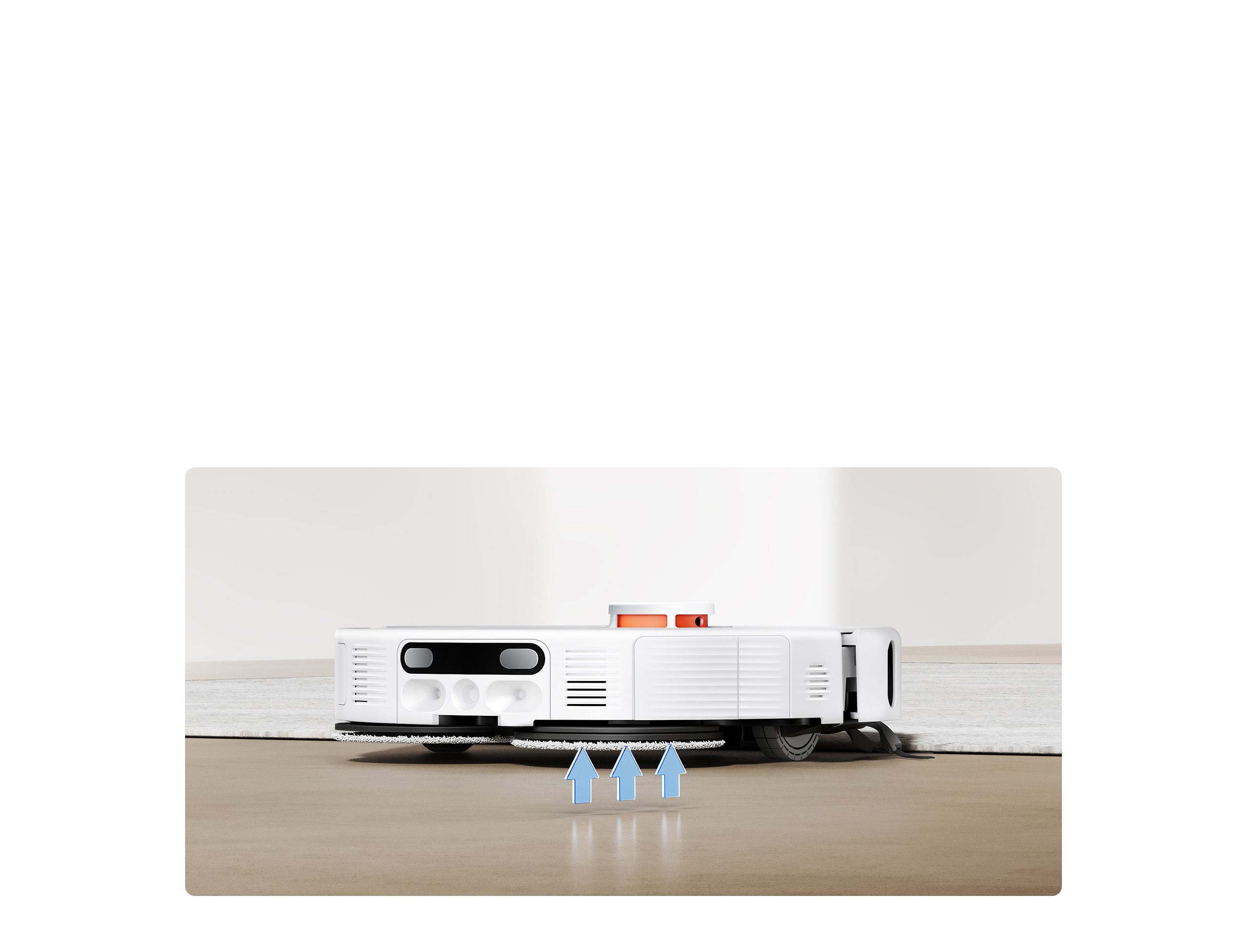機械拖布臂可動態調整以貼近邊緣,讓掃拖機器人能緊密沿著障礙物輪廓清潔,有效清理弧形牆面與不規則踢腳板等難以觸及的區域,同時不會卡住。