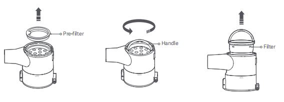 要卸下預篩檢程式,請拉起篩檢程式提手,然後逆時針轉動以取出篩檢程式;