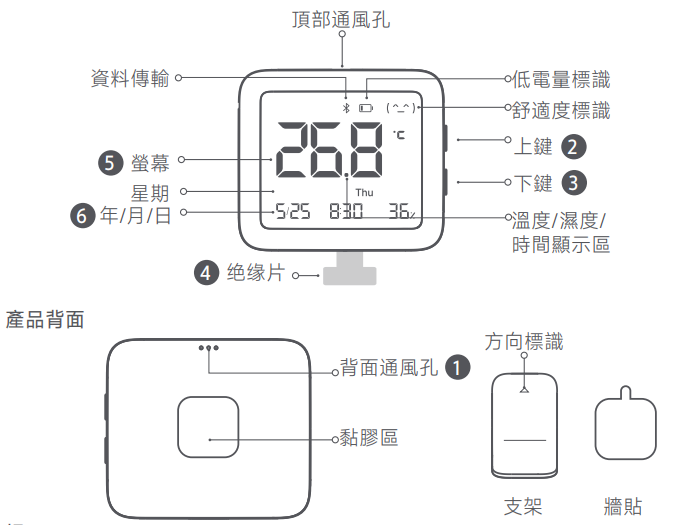 正面有頂部通風孔、低電量圖示、舒適度圖標、上鍵、下鍵、溫度/濕度/時間顯示區、資料傳輸、螢幕、星期/年/月/日和绝缘片。背面有背面通風孔、黏膠區、方向圖標、支架和牆貼。