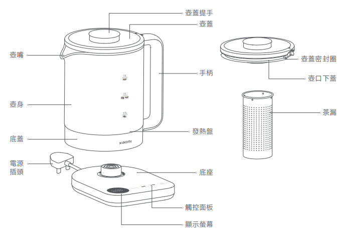 A:Xiaomi多功能養生壺N1由四個部分組成: