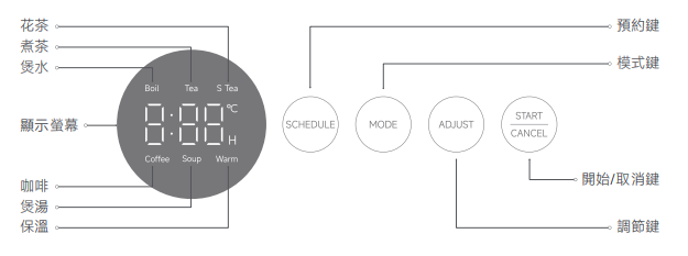 1. 開機後按“模式鍵”選擇所需的烹調模式,分別為:花茶,煮茶,燒水,咖啡,煲湯,保溫,選擇好後按開始/取消鍵即可開始烹飪。