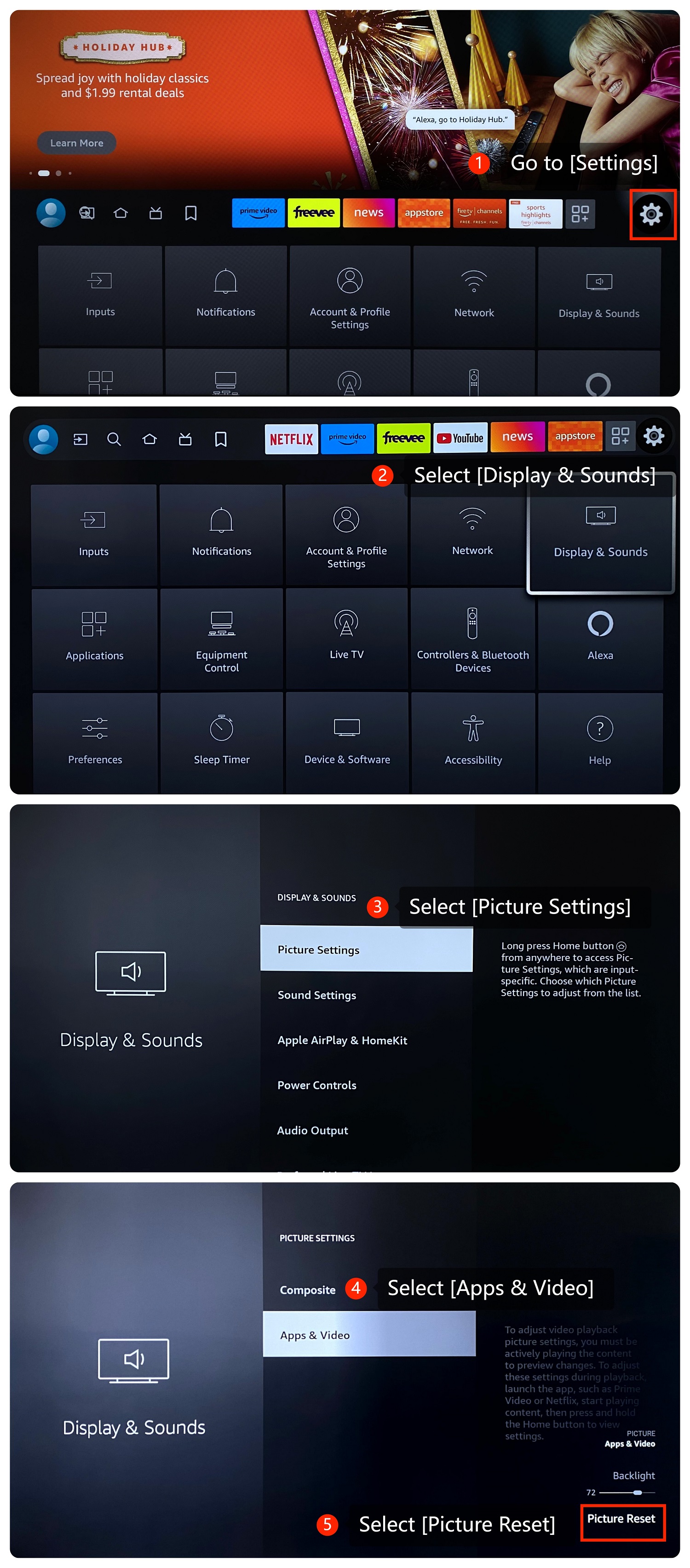 [設置]>>[顯示和聲音]>>[圖片設置]>>[應用和視頻]>>[圖片重置]