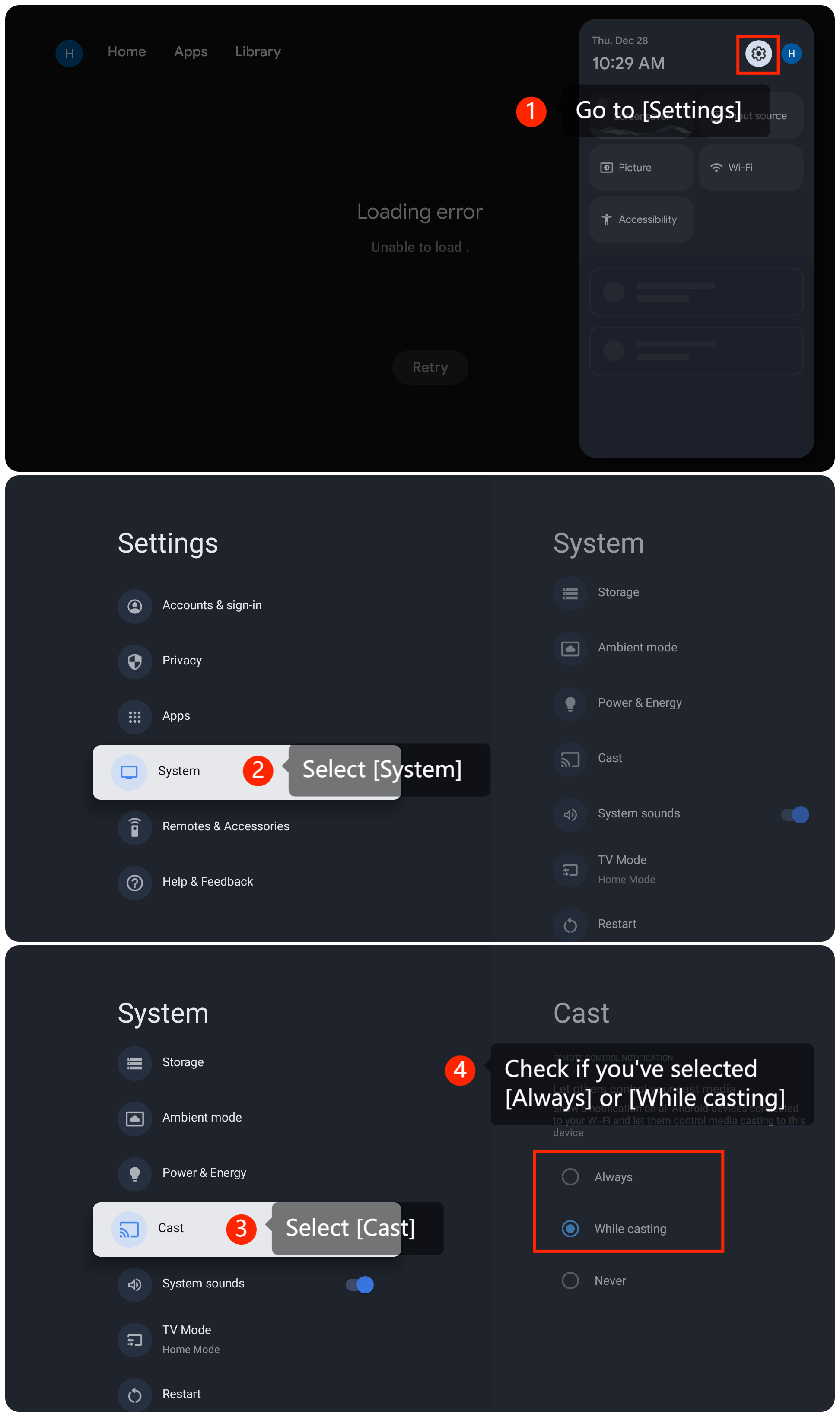 2. 轉到 [設置] >> [系統] >> [投射] 檢查您是否選擇了 [始終] 或 [投射時]>> 檢查您的電視上是否啟用了 Chromecast;