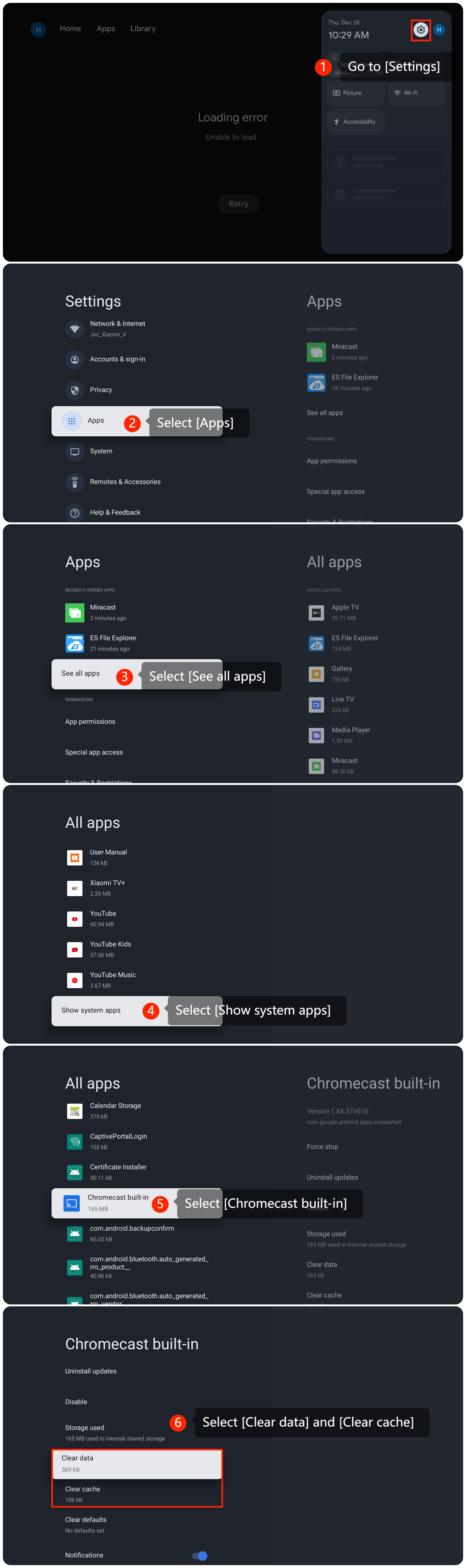 3. 您可以通過導航到 [設置] >>[應用程式] >> [查看所有pps] >> [顯示系統應用程式]>>向下滾動並選擇 [Chromecast 內置] >> [清除 d ata] 和 [清除 ] 來清除 Chromecast 的快存和數據c疼痛];