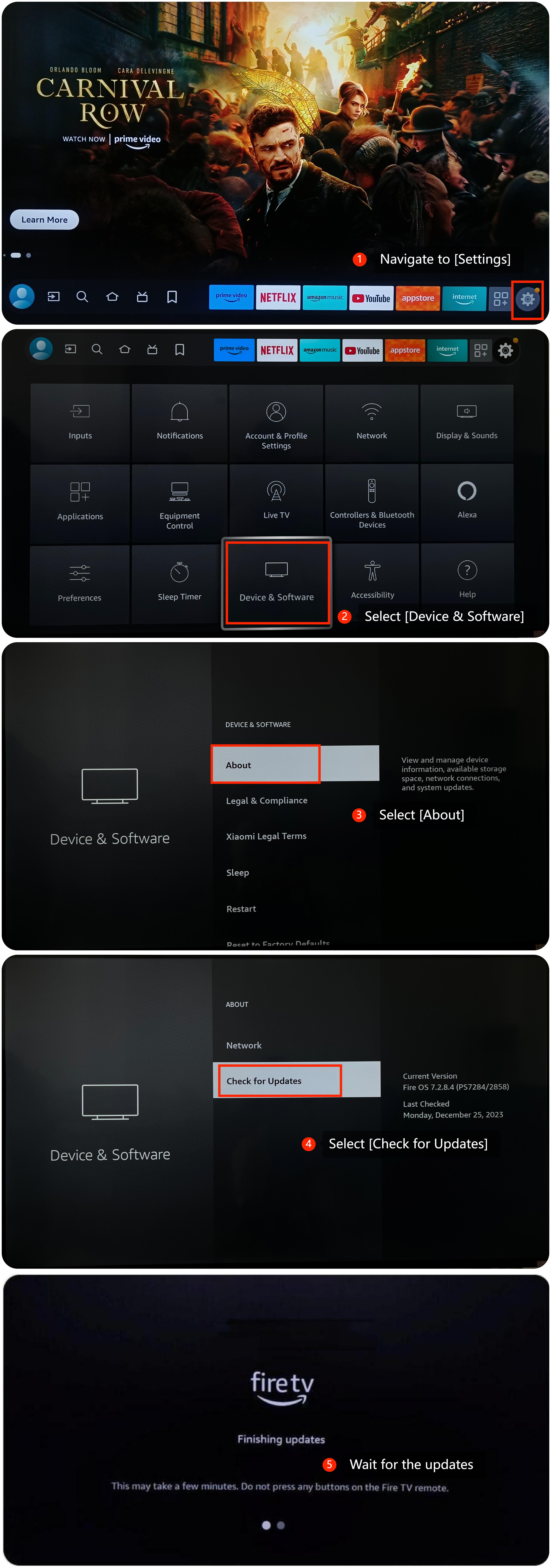 6. 確保小米Fire TV已安裝最新的韌體更新。更新可能會解決與電源管理和指示燈相關的問題。要檢查更新,請轉到