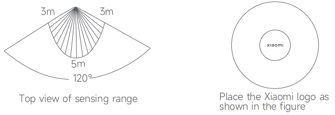 感應範圍與安裝高度有關。圖示感應距離基於 1.2 米的安裝高度,並使用夜燈上的小米標誌進行檢查,位置如圖所示。