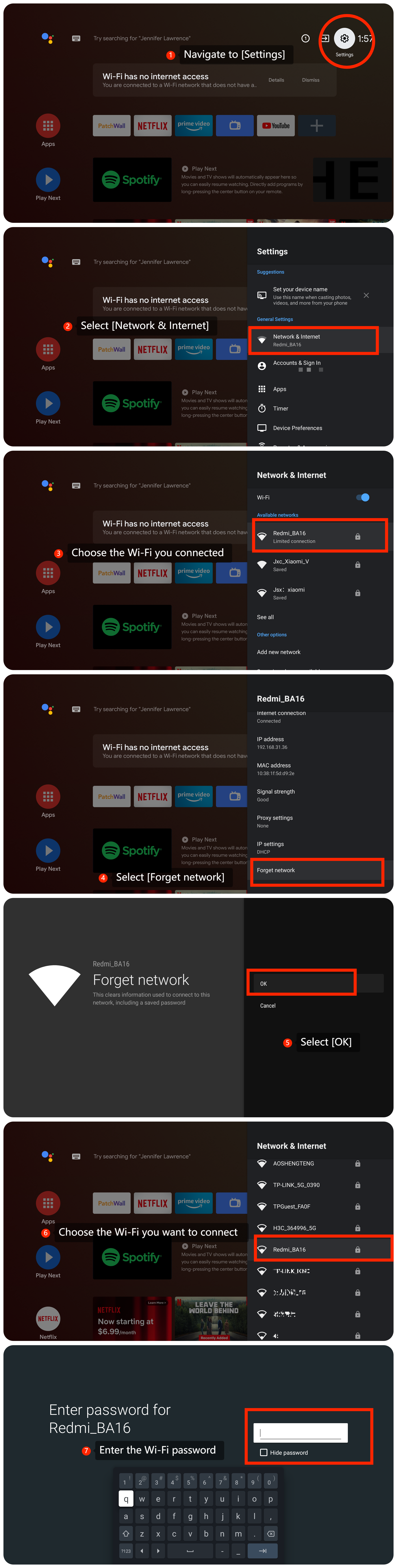 3. 如果您正在使用 Wi-Fi,請嘗試重新連接 Wi-Fi,看看是否能解決問題,方法是導航到 [設置] >> [網路和互聯網] >>選擇您連接的 Wi-Fi >> [忘記網络] >> [確定] >>選擇要連接的 Wi-Fi,>>輸入 Wi-Fi 密碼並確認;