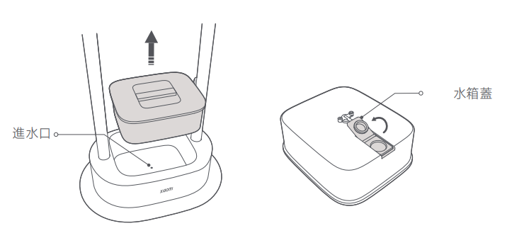 2. 加水:向上拉出水箱,打開水箱蓋,加入適量純淨水。蓋緊水箱蓋,將水箱裝回主機;