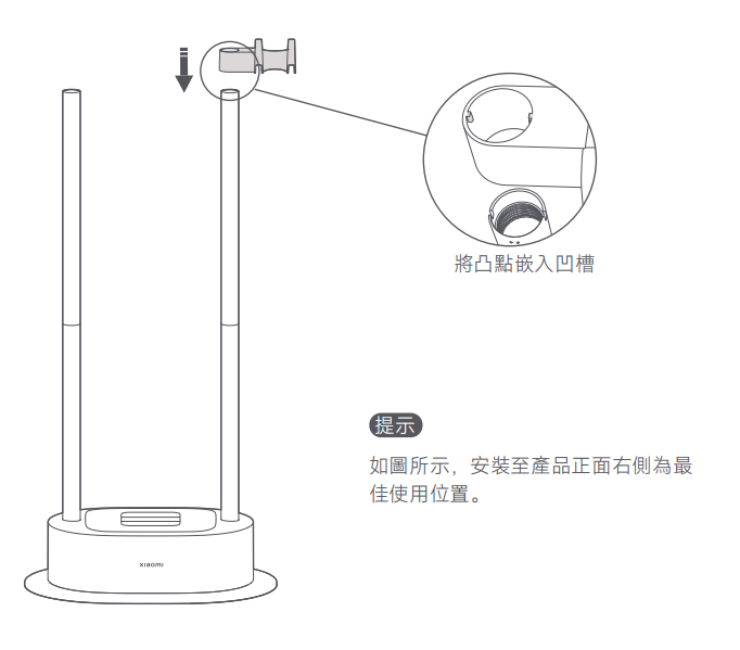 A:Xiaomi 立式掛燙機無需借助工具即可簡單手動安裝,說明書有詳細介紹配件安裝方法、方式,且配有圖片說明,可以很清楚的指引正確安裝。