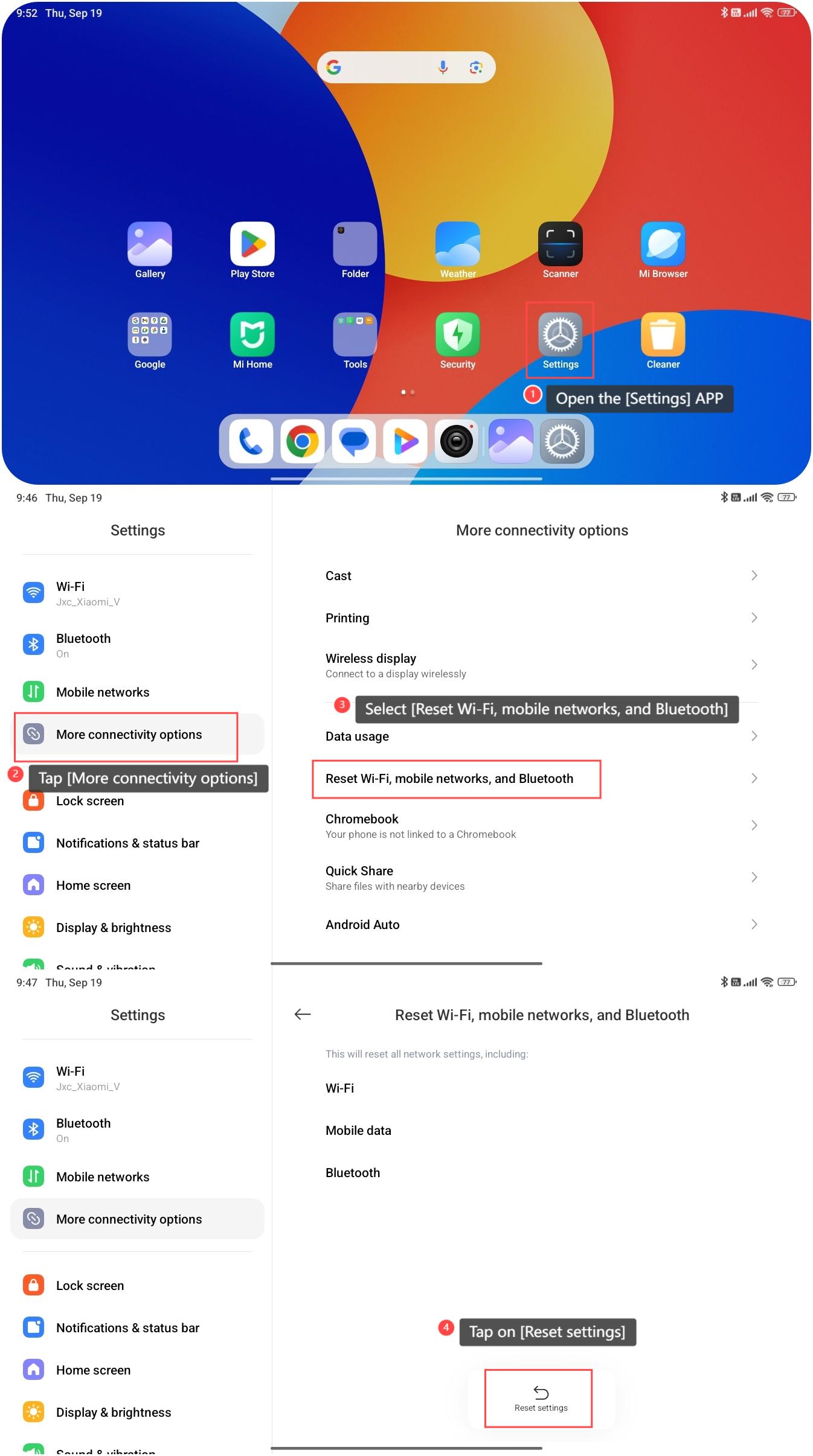 如何在 Redmi Pad SE 8.7 4G 上重置Wi-Fi、移動網路和藍牙?