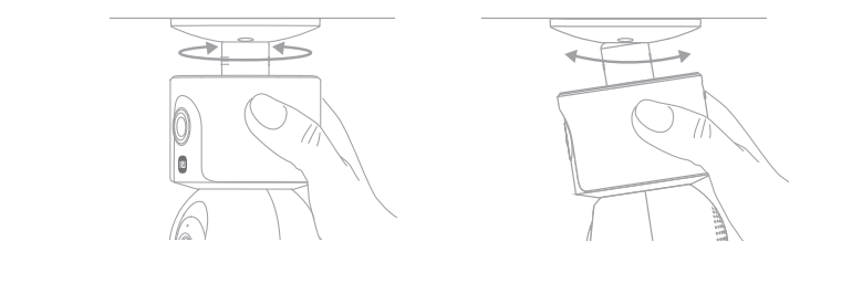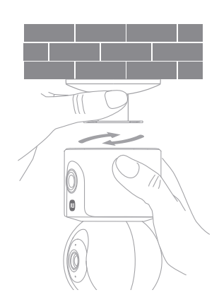 5. 使用壁掛支架上的調節樞軸將攝像機調整到所需的角度。按住並旋轉相機本體以調整固定相機鏡頭的水準方向,並沿著壁掛架上標有“