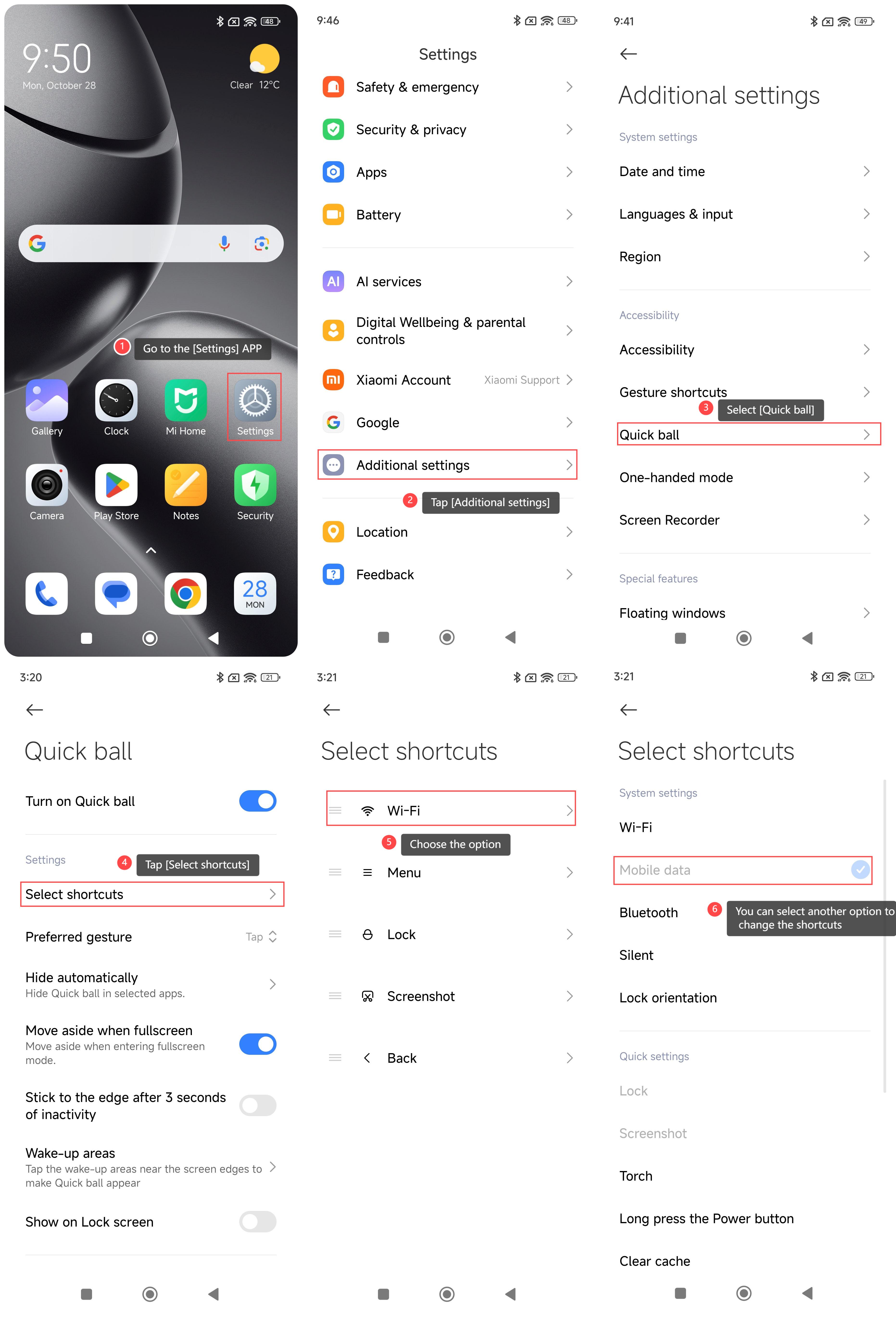在 Xiaomi 14T Pro 上設置 Quick ball 快捷方式的功能可讓您快速存取常用的操作和工具,從而提高便利性和效率。使用可自定義的快捷方式,您可以分配Back、Home、Recent apps、Screenshot等功能,以便從任何螢幕輕鬆訪問它們,而無需瀏覽功能表。