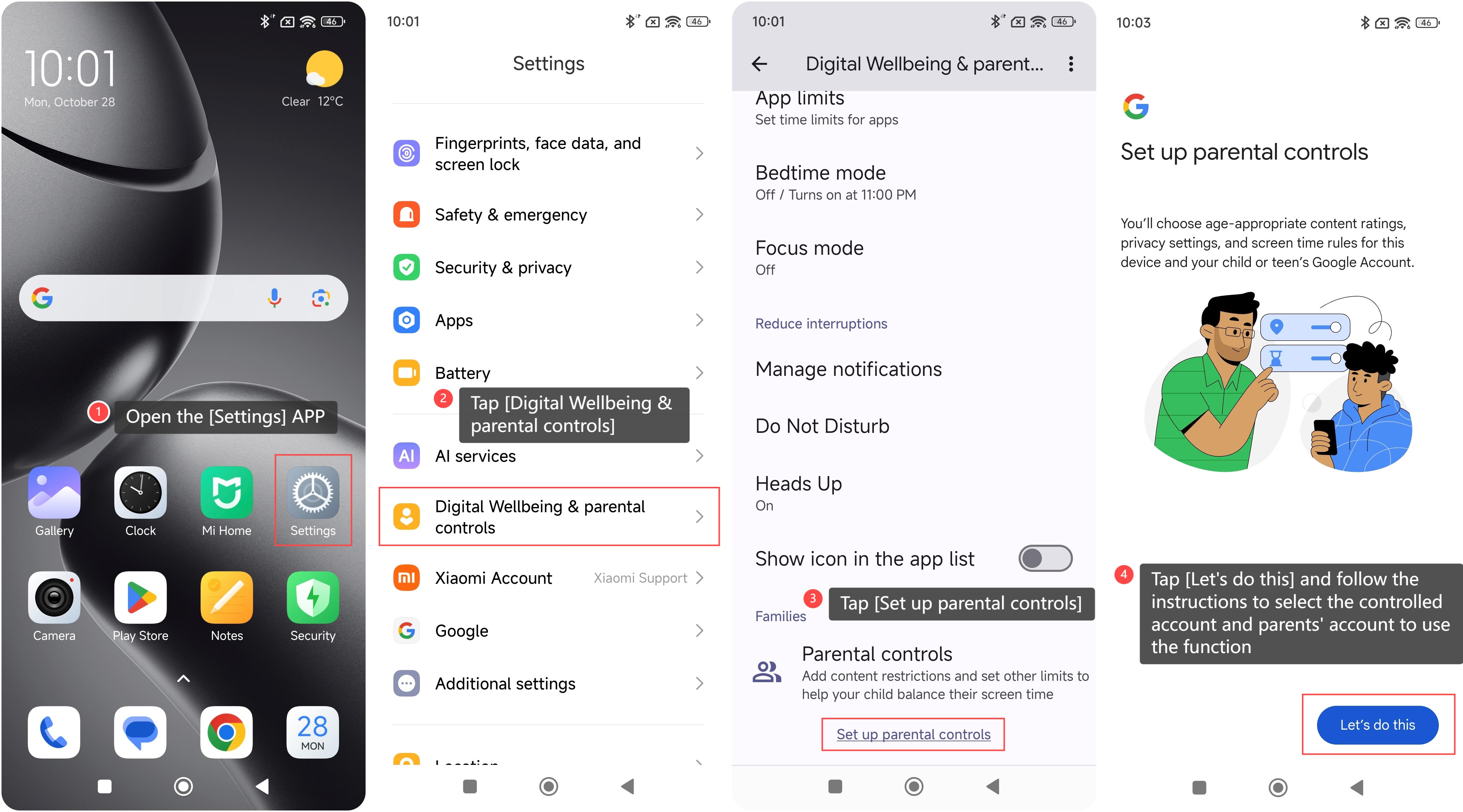 Xiaomi 14T Pro 提供家長控制功能,以説明管理螢幕時間和設置內容限制,允許您為孩子的 Google 帳戶和設備選擇適合其年齡的內容分級、隱私設置和螢幕時間規則。要使用手機上的家長控制,請參考以下步驟:1. 打開手機上 的【設置】APP;2. 向下滑動找到並點擊 [數位健康和家長控制];3. 向下滑動找到並點擊 [設置家長控制];4. 點擊 [Let's do this] 並按照說明選擇受控帳戶和家長帳戶以使用該功能。