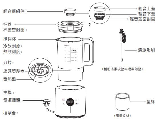 Xiaomi 破壁料理機的標準包裝:破壁機 x 1、攪拌杯 x 1、輕音蓋 x 1、量杯 x 1、清潔刷 x 1、用戶手冊 x 1和保固通知 x 1。 下麵是Xiaomi 破壁料理機各部件的介紹: 蓋子上部有靜音蓋組件(輕音上蓋、輕音下蓋、輕音蓋密封圈),有杯蓋密封圈。 產品配有攪拌杯,有冷飲刻度和熱飲刻度。攪拌杯內部有刀片、溫度感測器和發熱盤。產品還配有主機,主機上有控制臺。該產品還配有電源插頭、清潔毛刷和量杯。 注意: 使用手冊中的產品、配件及用戶介面圖示僅供參考,實際產品及功能會因產品改進而有所差異。