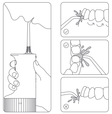 水流應與牙齦線呈90°角。建議從後牙開始清潔,緩慢地將噴嘴沿著牙齦線向前牙移動,並在牙齒之間短暫停留。