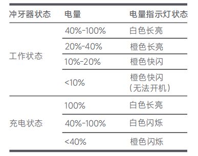 沖牙器運作時,電池電量指示燈會顯示不同的狀態。