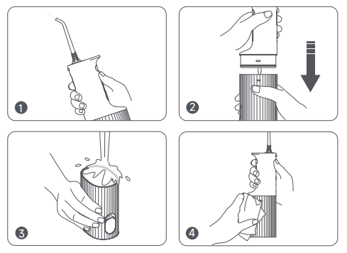 每次使用後,請清空水箱,然後讓灌溉器空轉幾秒鐘,排出剩餘的水。打開水箱蓋,讓灌溉器通風,或將水箱向下拉,並將灌溉器和水箱放置在通風良好的地方。待水箱內部乾燥後,將其向上推回,並蓋上蓋子。