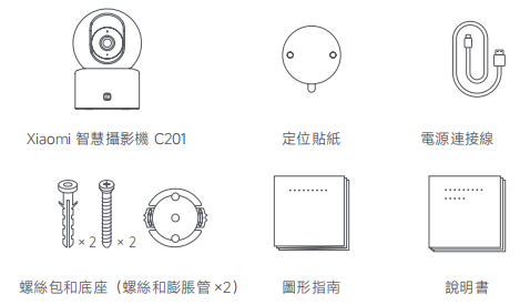 Xiaomi 智慧攝影機 C201 × 1、定位貼紙 × 1、螺絲包和底座(螺絲和膨脹管 × 2)、電源連接線 × 1、圖形指南× 1、說明書 × 1。