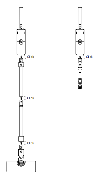 下延長桿與空氣地刷採用防錯裝設計。將空氣地刷連接件的兩個凸起對準下延長桿的兩個凹槽。插入後,聽到清晰的“咔噠”聲表示安裝正確。如果沒有聽到聲音或連接明顯鬆動,請重新連接以確保安裝正確。