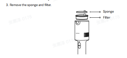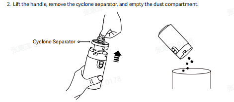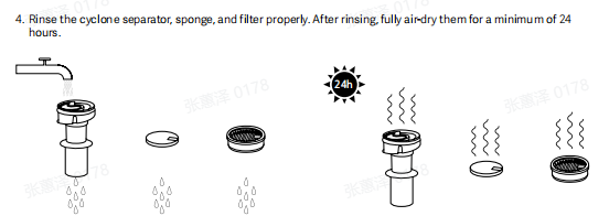 若意外吸入液體,請停止使用,拆卸主機,取出吸塵器的集塵室、旋風分離器、預過濾網和後置過濾網。將集塵室、旋風分離器和主機放置在通風良好的陰涼處風乾。用清水清洗預過濾網和後置過濾網,待其完全乾燥後再重新組裝使用。