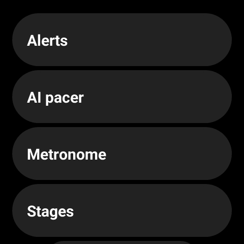 1. 您可以在手錶上輕觸運動應用程式以進入運動清單。在運動清單中輕觸特定運動以進入開始介面。您可以輕觸開始介面底部的【設定】圖示進行設定。