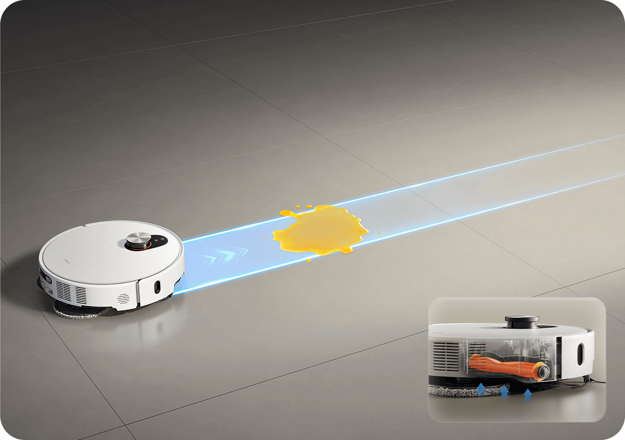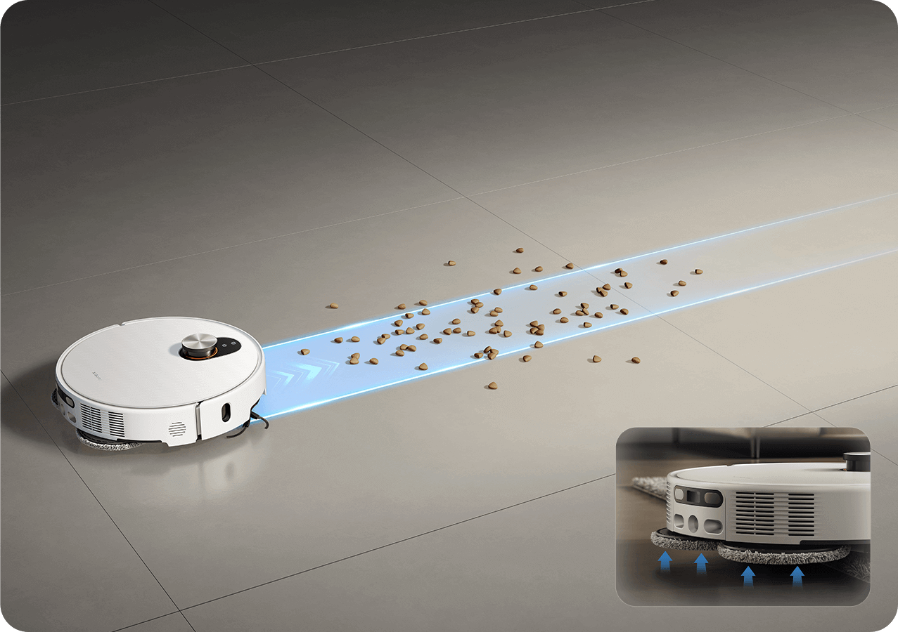 The extendable mop and side brush automatically extend to achieve millimetre-level cleaning of dust along edges and corners. Combined with a separate water tank and precise water output control, the robot vacuum leaves floors sparkling clean.