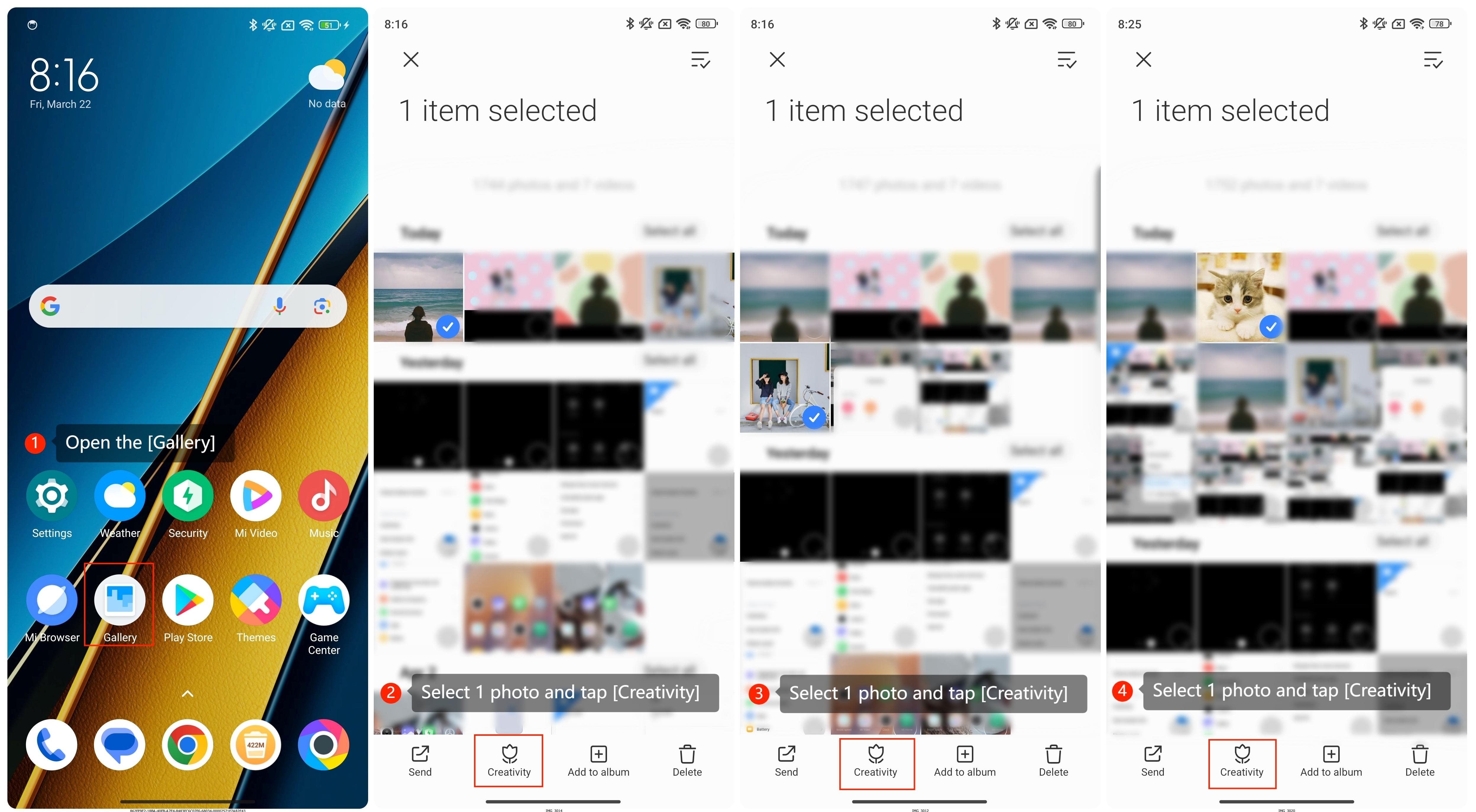 2. Press and hold one photo and select [Creativity], such as single, double or pet image;