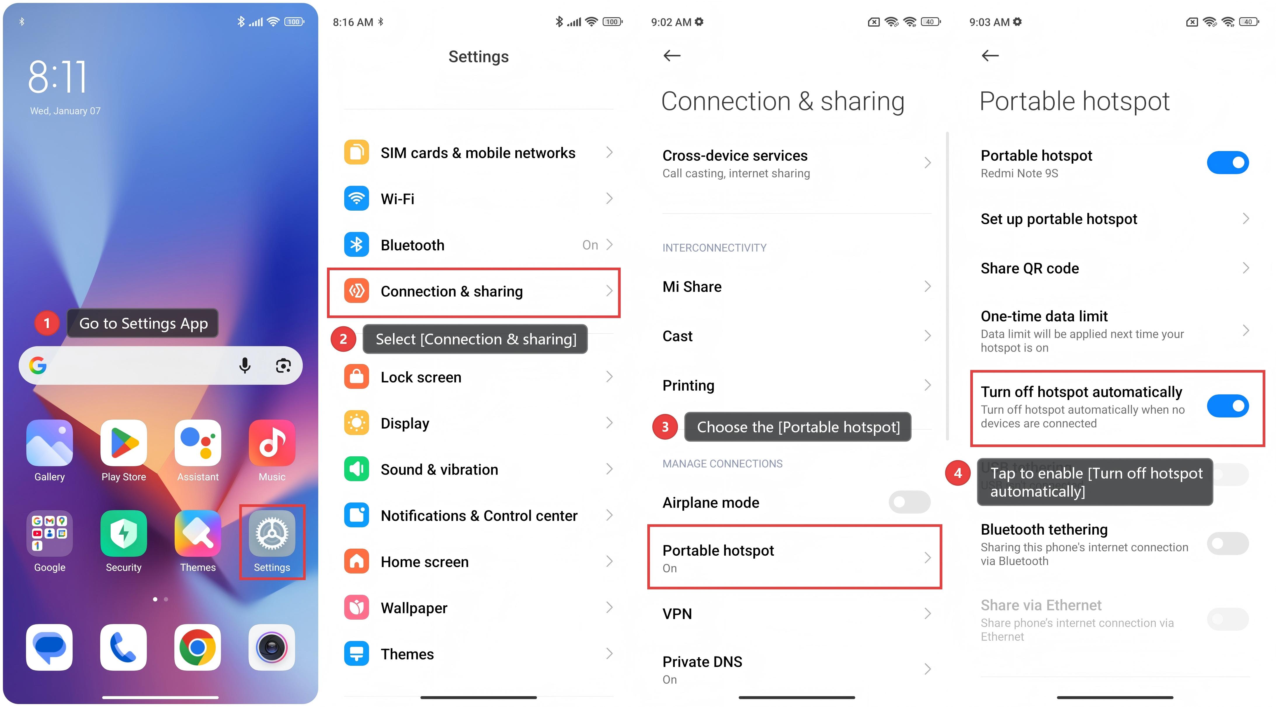 To turn off the hotspot automatically on the Xiaomi smartphone, please refer to the following steps: