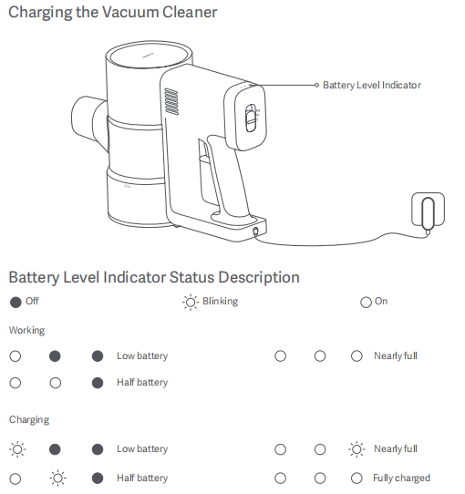 What is the meaning of each state of the Xiaomi Vacuum Cleaner G20 battery indicator?