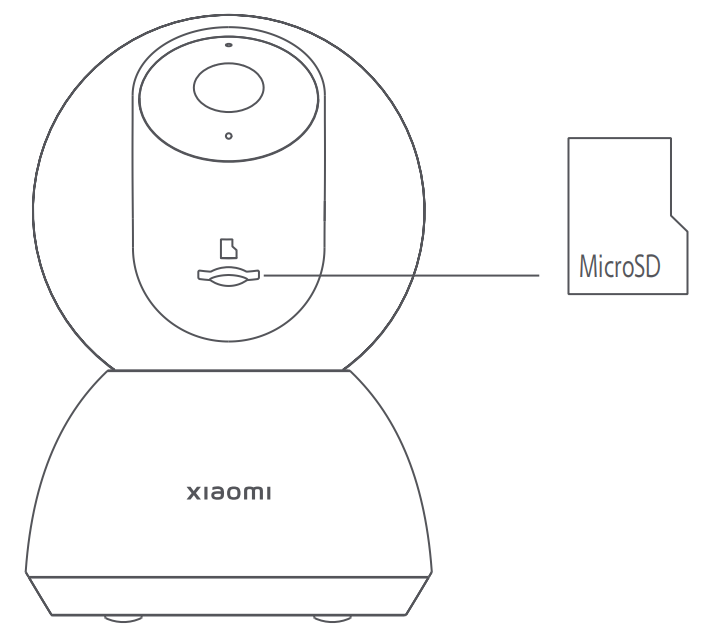 To install the MicroSD card, please refer to the following methods: 1. Disconnect the USB power cable with the camera; 2. Rotate the lens upward until the MicroSD card slot shows up; 3. Insert the MicroSD card into the card slot with its contact points facing downward. Note: 1. Disconnect the camera from the power before installing or removing a MicroSD card; 2. Please use a genuine MicroSD card (up to 256 GB) manufactured by a qualified supplier; 3. The MicroSD card needs to be purchased separately. It is recommended to use a MicroSD card with a reading/writing speed of no less than U1/Class 10.