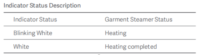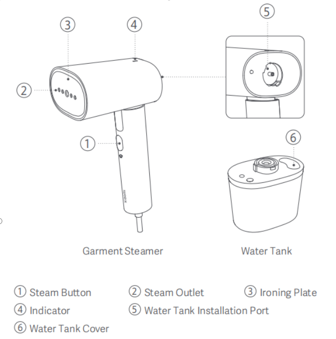 For your reference, the appearance of the Xiaomi Handheld Garment Steamer is as below: 1. Steam Button; 2. Steam Outlet; 3. Ironing Plate; 4. Indicator; 5. Water Tank Installation Port; 6. Water Tank Cover. Here are the indicator status as below: 1. When the device is heating, the indicator blinks in white; 2. The white light is always on indicating heating is completed.