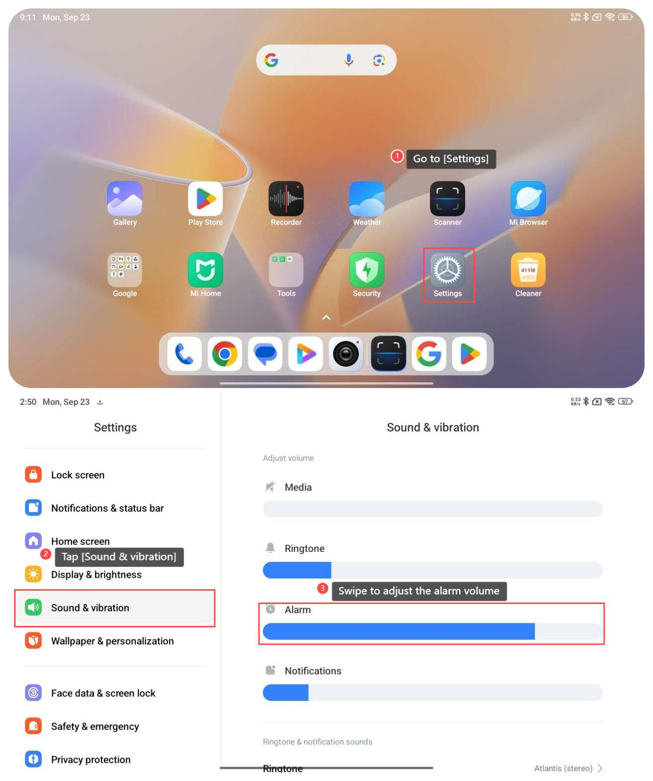 Adjusting alarm volume on the REDMI Pad SE 8.7 4G offers several functions. You can customize the volume to match your comfort level, ensuring a pleasant waking experience. Adjusting the volume based on room acoustics or personal habits helps improve effectiveness in different settings. Lowering the volume can prevent waking others in shared living spaces while still ensuring you hear the alarm. To adjust the alarm volume on your tablet, please refer to the following steps: 1. Go to [Settings]; 2. Tap [Sound and vibration]; 3. Swipe left or right to increase or decrease the alarm volume.