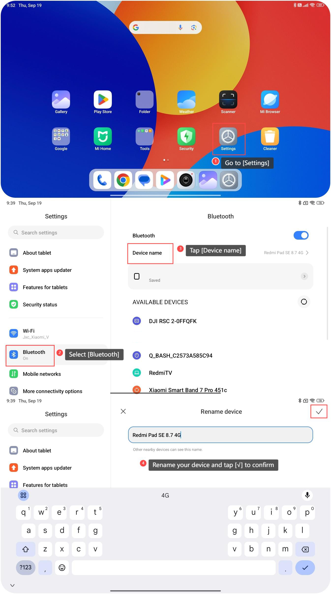 The REDMI Pad SE 8.7 4G supports the built-in feature of customizing the device name via Bluetooth as your preference to meet your individual requirements. To edit the Bluetooth name of your device, please refer to the following steps: 1. Go to [Settings]; 2. Select [Bluetooth]; 3. Tap [Device name]; 4. Rename your device and tap [√] to confirm. Note: 1. After renaming your device, other nearby devices can see this name. You can recognize your device’s Bluetooth name and connect your device via Bluetooth more quickly to have an improved and convenient using experience; 2. If you are connecting to Bluetooth accessories or other devices in public places, having a unique name makes it less likely for someone to mistakenly connect to your device.