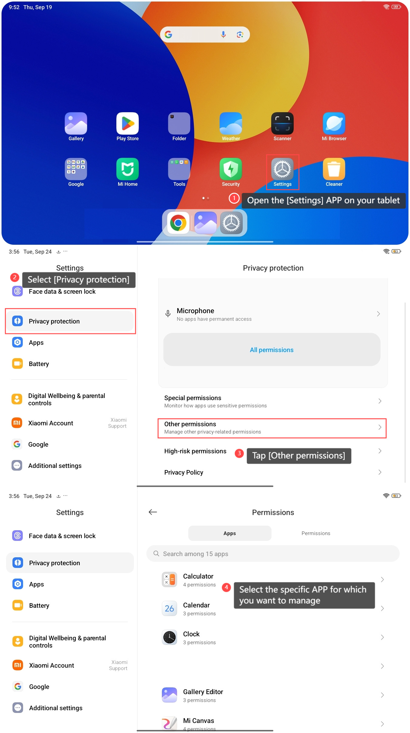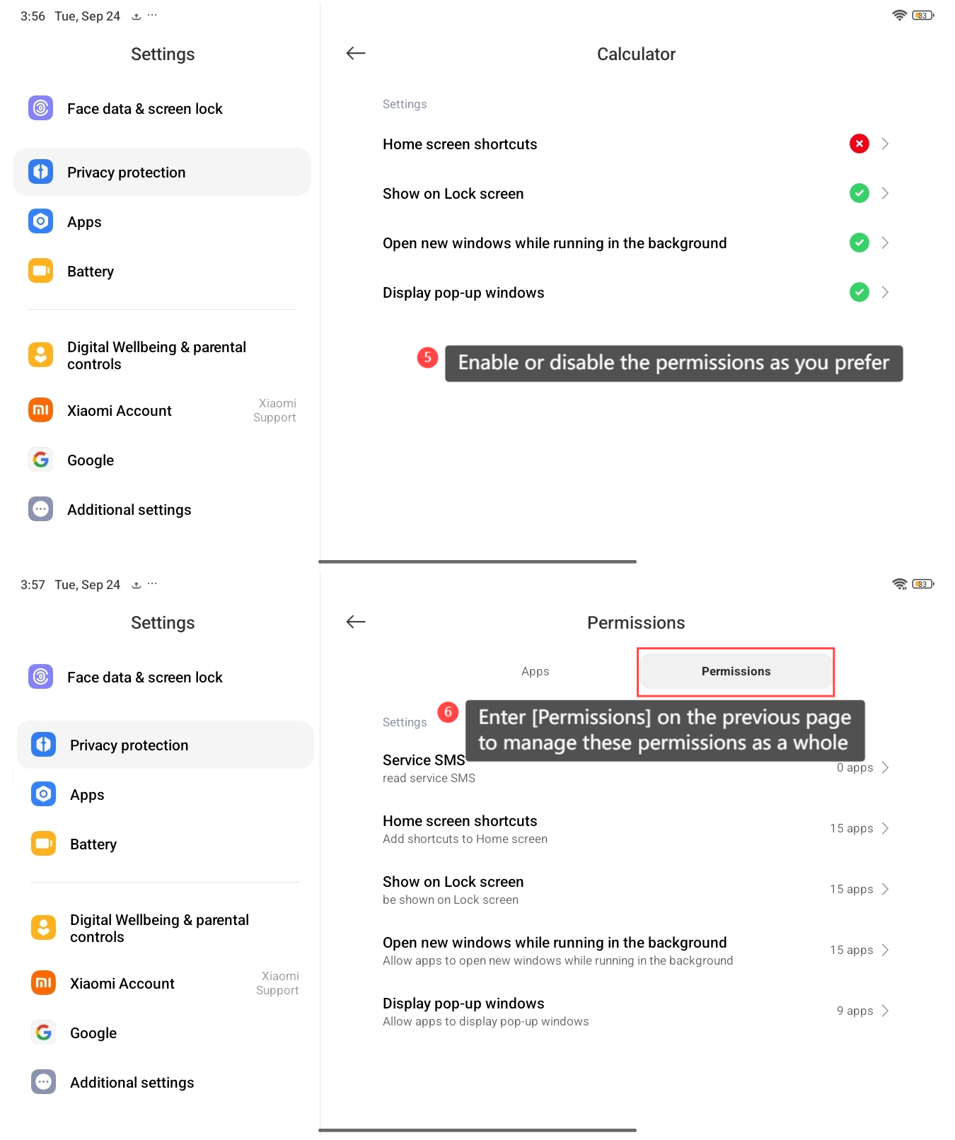The REDMI Pad SE 8.7 supports checking the other permissions of APPs, which support Service SMS, Home screen shortcuts, Show on Lock screen, Open new windows while running in the background, and Display pop-up windows. It allows better control the privacy-related permissions. To check the other permissions of APPs on your tablet, please refer to the following steps: 1. Open the [Settings] APP on your tablet; 2. Select [Privacy protection]; 3. Tap [Other permissions]; 4. Select the specific APP for which you want to manage; 5. Enable or disable the permissions as you prefer, such as [Home screen shortcuts], [Show on Lock screen], [Display pop-up windows], and so on; 6. Additionally, you can also enter [Permissions] on the previous page to manage these permissions as a whole.