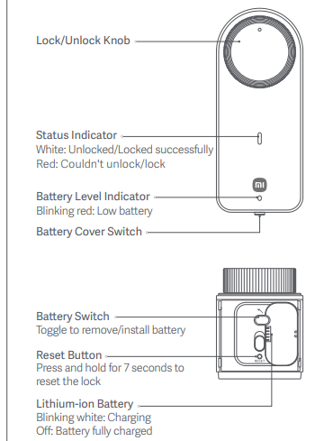 The Xiaomi Self-Install Smart Lock features a well-designed and intuitive appearance. It includes a lock/unlock knob for manual operation and a status indicator that displays white when the lock or unlock operation is successful and red when it fails.