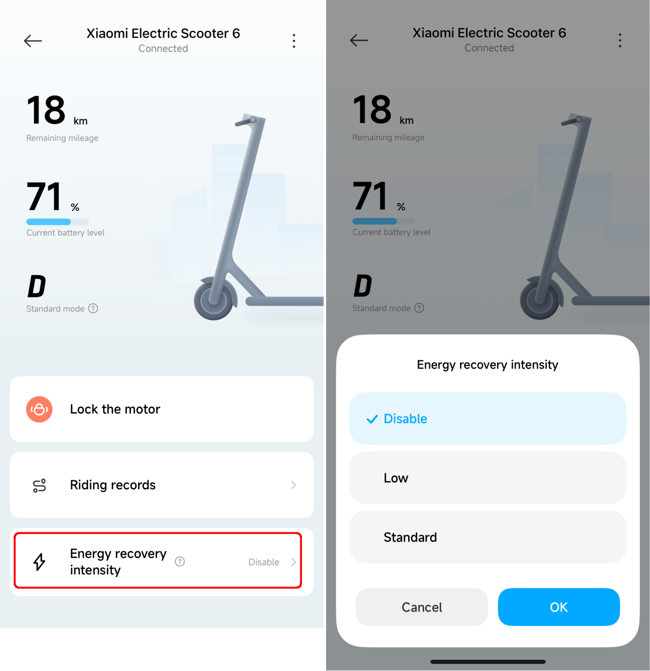 A: After connecting the scooter to the Xiaomi Home App, select [Energy recovery intensity] on the homepage to access the secondary page, and then select the desired energy recovery level on the pop-up page. This function is disabled by default.