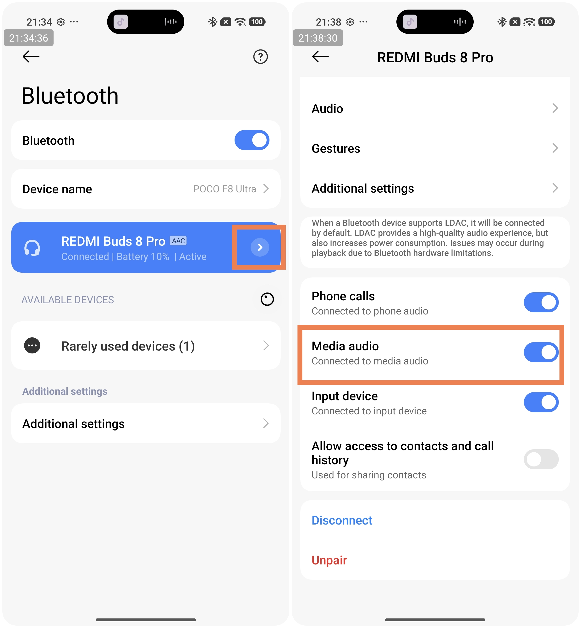 A: Please go to the phone's Bluetooth settings, tap the paired REDMI Buds 8 Pro, and make sure the [Media audio] option is enabled. If [Media audio] is turned off, there will be no sound when listening to music or watching videos, and this option needs to be manually enabled.
