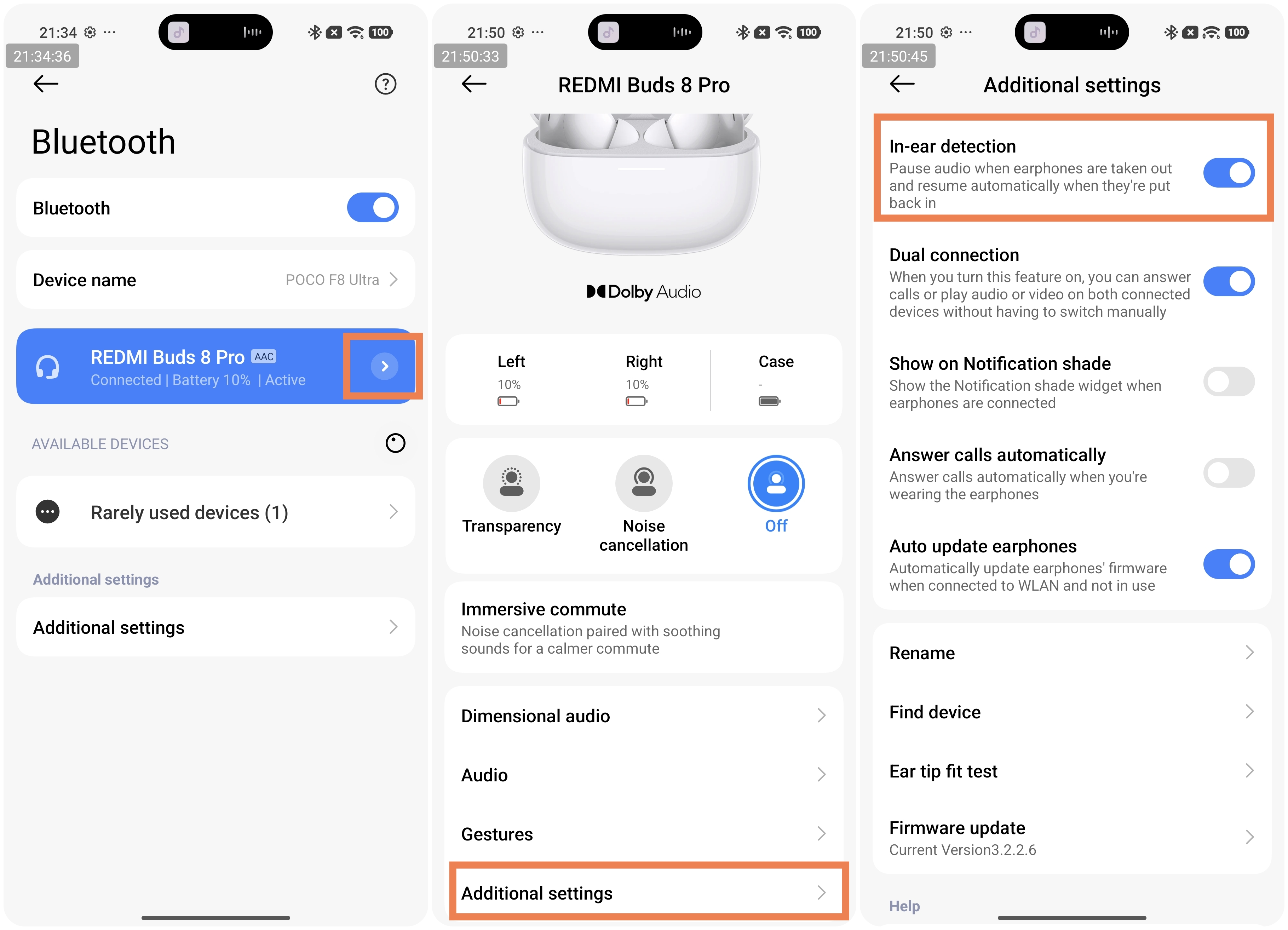 A: On a Xiaomi phone, go to [Settings] >> [Bluetooth] >> tap the [>] icon on the right side of [REDMI Buds 8 Pro] >> put on the earbuds and tap [Immersive commute] >> choose [Airplane], [Public transit], [Train], and [Off].