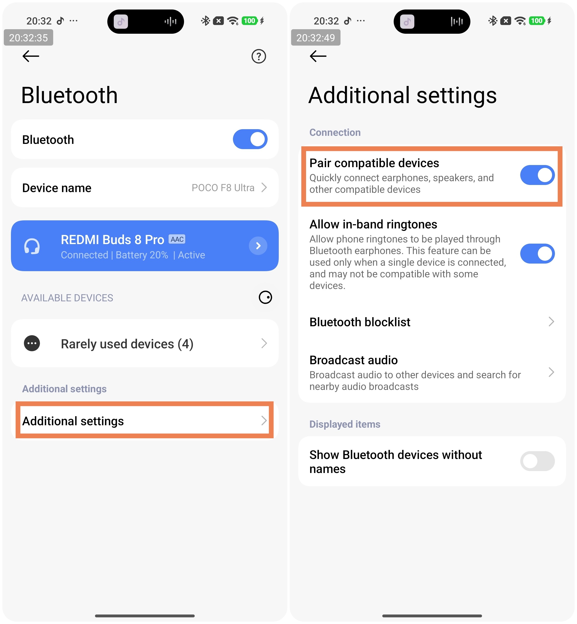 To use the Pair compatible devices feature, your phone’s system must be updated to the latest stable version. Currently, this feature is only supported on some Xiaomi phones. Take a Xiaomi phone with HyperOS as an example. To enable it, go to [Bluetooth] >> [Additional settings] >> turn on [Pair compatible devices].