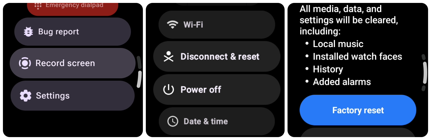 1. The phone and watch appear to have completed pairing, but the binding was not successfully established. In this case, the phone and watch remain disconnected. You can press and hold the power button on the watch >> swipe down and tap [Settings] >> select [Disconnect & reset] >> tap [Factory reset]. After restoring factory settings, try pairing again.