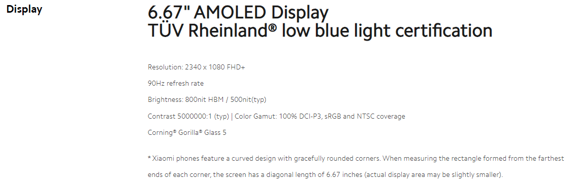 Một số mẫu máy còn hỗ trợ tăng cường độ sáng màn hình ở các điểm sáng trên màn hình khi phát một số video HDR nhất định có nội dung video được hiển thị hiệu ứng hình ảnh tốt hơn. Ví dụ, hình dưới đây là thông số màn hình của Mi 10.