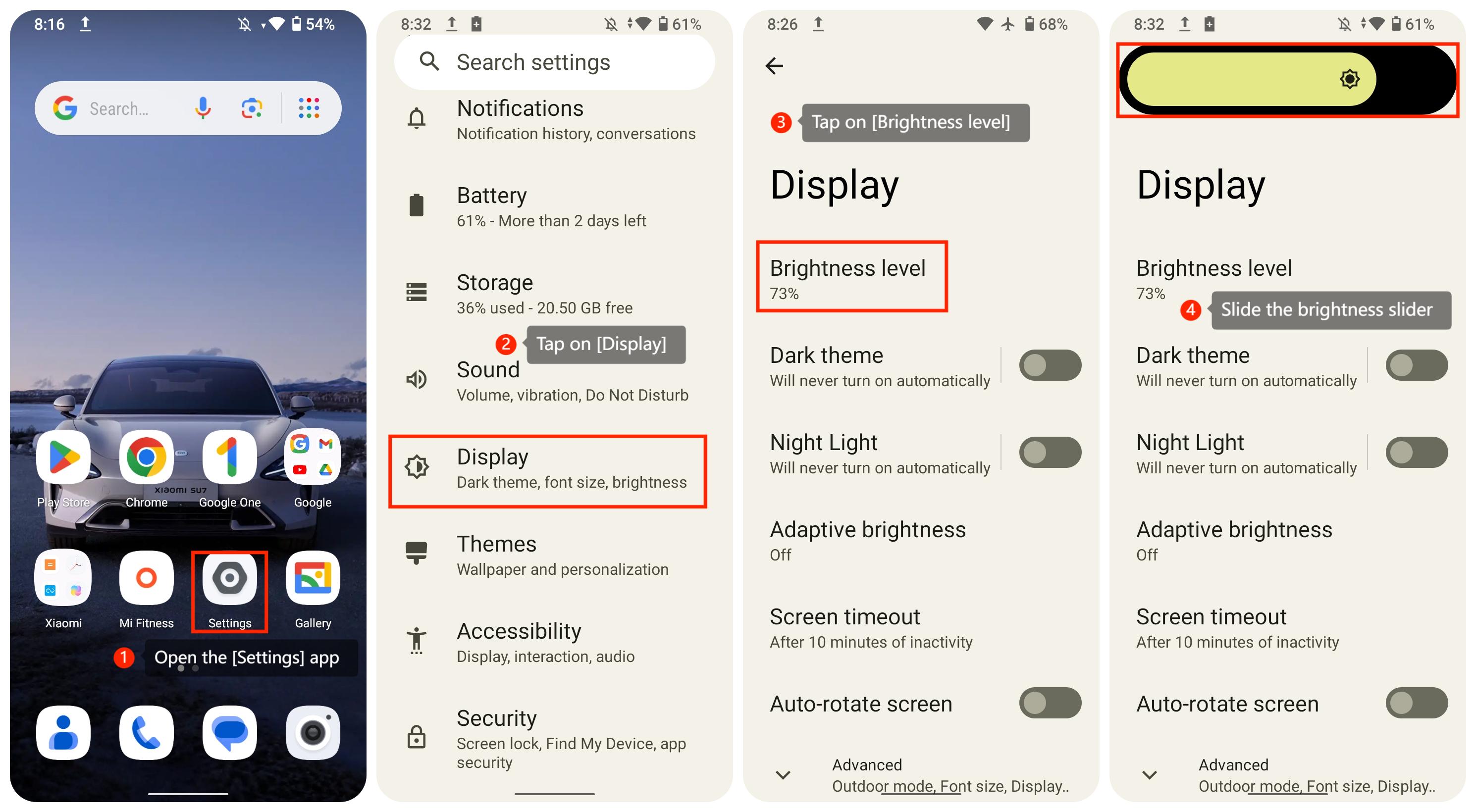 Độ sáng của Redmi A1 có thể được điều chỉnh cho phù hợp với sở thích của bạn để mang lại trải nghiệm tốt hơn và tối ưu hóa tuổi thọ pin.