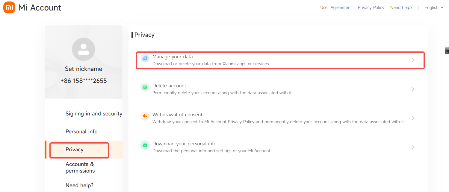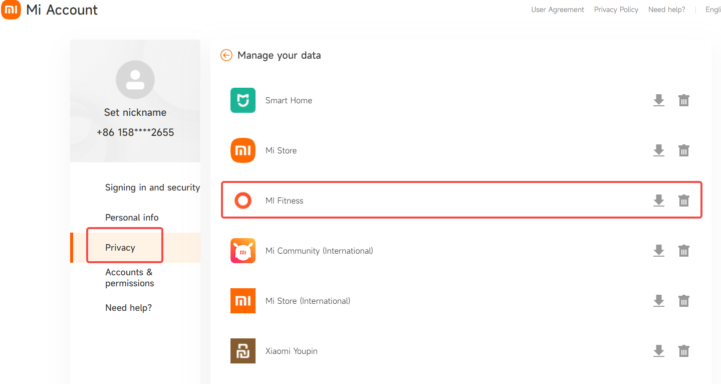Các bước hoạt động: Quyền riêng tư - Quản lý dữ liệu của bạn - MI Fitness, nhấp vào nút "Tải xuống" ở bên phải và làm theo lời nhắc để liên kết email của bạn để hoàn tất thao tác.