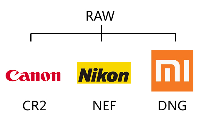 Các máy ảnh khác nhau có phần mở rộng khác nhau cho các tệp RAW. Các định dạng RAW phổ biến bao gồm định dạng CR2 của Canon, định dạng NEF của Nikon, v.v., không tương thích giữa các thương hiệu.