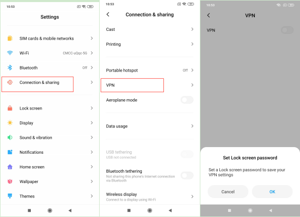 Phương pháp cài đặt cụ thể: Cài đặt>> Kết nối &; chia sẻ >> VPN, bật VPN và đặt mật khẩu màn hình khóa.