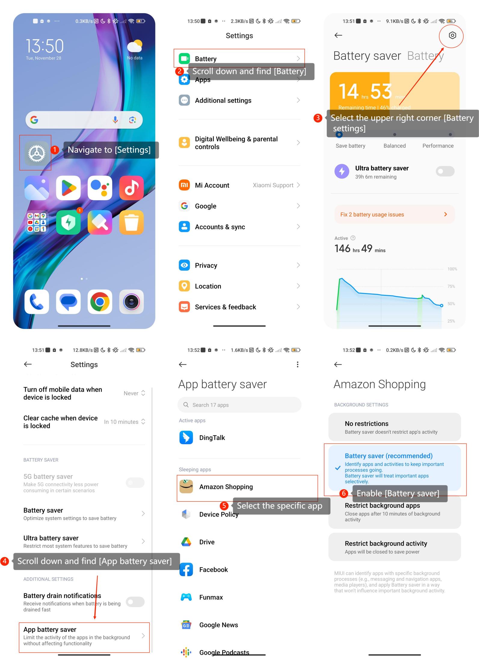 Điều hướng đến [Cài đặt] >> cuộn xuống và tìm [Pin] >>chọn góc trên bên phải[Cài đặt pin] >> cuộn xuống và tìm [Trình tiết kiệm pin ứng dụng] >> chọn các ứng dụng cụ thể mà bạn muốn bật [Trình tiết kiệm pin B].