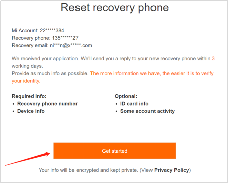 Cách2 - Liên kết số điện thoại mới với tài khoản Mi Đặt lại số điện thoại mới cho tài khoản nếu gặp sự cố sau. • Không còn sử dụng số điện thoại hoặc email liên kết với tài khoản Mi Các bước để liên kết một số điện thoại mới: 1. Truy cập https://id.mi.com 2. Nhấp vào 'Quên mật khẩu' trên trang (xem hình 9) 3. Nhập số điện thoại hoặc Email và nhấp vào 'Khôi phục thông tin bảo mật' (xem hình 10-1 & 10-2) 4. Làm theo hướng dẫn để thực hiện. (xem hình 11) Sau khi số điện thoại mới được liên kết với tài khoản Mi, vui lòng đặt lại mật khẩu. Hình 9 Hình 10-1 Hình 10-2 Hình 11 Cách3 - Gửi ứng dụng mở khóa để đặt lại mật khẩu: Một cách khác để đặt lại mật khẩu là gửi ứng dụng mở khóa nếu gặp phải các vấn đề như bên dưới. • Không sử dụng số điện thoại hoặc email liên kết với tài khoản Mi trong thời gian dài • Quên số điện thoại hoặc email liên kết với tài khoản Mi