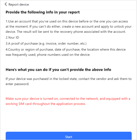 Các bước để gửi đơn đăng ký mở khóa: 1. Truy cập https://i.mi.com/ 2. Nhấp vào 'Gửi ứng dụng mở khóa' (xem hình 12) 3. Nhập hai thông tin: • Số IMEI hoặc mã mở khóa (xem hình 13): • Số IMEI có thể được tìm thấy trên bao bì của điện thoại • Có thể nhìn thấy mã mở khóa khi có lời nhắc nhập mật khẩu tài khoản Mi sau khi xóa sạch dữ liệu và khởi động lại để thoát khỏi chế độ Khôi phục (xem hình 2) • Khu vực hoặc quốc gia nơi thiết bị được mua Lưu ý: nếu khu vực hoặc quốc gia không được bao gồm trong các tùy chọn, cách này sẽ không phù hợp. Vui lòng tham khảo Q3 như dưới đây để giải quyết vấn đề. 4. Chọn 'Báo cáo thiết bị' (xem hình 14) 5. Chọn 'Gửi đơn đăng ký' (xem hình 15) 6. Nhấp vào 'Bắt đầu' và làm theo các bước để cung cấp thông tin cần thiết (xem hình 16)
